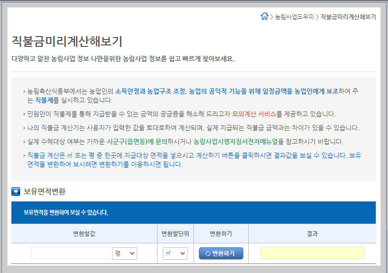 기본형 공익직불금 금액은 소규모 농가인 경우에 약 120만 원 정액으로 지급되며 농지 명적인 0.5ha 이하로 직불금 모의계산으로 직불금을 미리 계산할 수 있습니다.