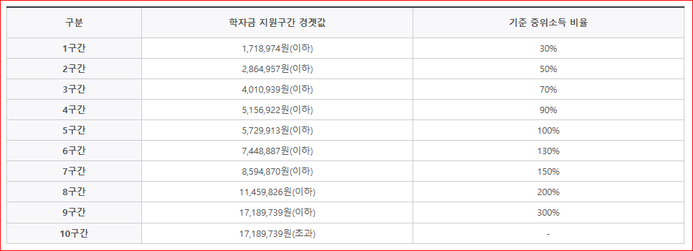 학자금 지원구간별로 받을 수 있는 최대 지급 금액을 확인하시기 바랍니다.