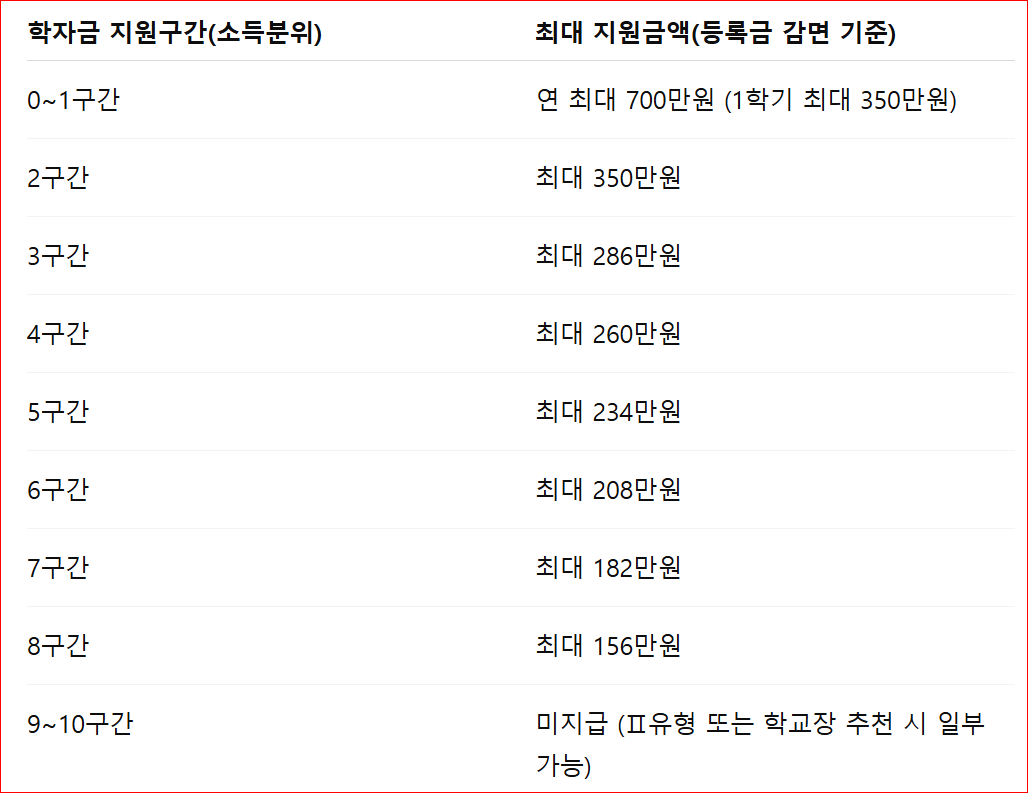 소득분위별 최대 지원: 1구간 350만원 (1학기 기준)